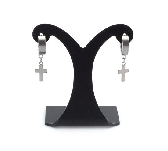 Stainless steel oorbelstekers met een kruisje als hanger, voorzien van een kliksluiting.